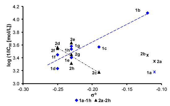 Figure 3. Dependence of PET-inhibiting activity log (1/IC50 [mol/L]) of studied carbamates 1a1h and 2a2h on electronic properties expressed as Taft polar constants σ* of alkyl tail R2.
