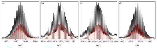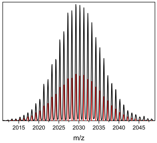 Selected area of the ESI-MS spectrum obtained by examination of a thf solution of compound 1. The mass spectrum was acquired in positive ion mode (4500 V, 300 °C), monitoring 1 with an additionally attached [Cu-NHC]+ moiety at m/z 2029.3 [(NHCDippCu)2{η3-Ge9(Si(iPr)3)3}]+. The calculated pattern with the characteristic isotope distribution is shown below as red bars.