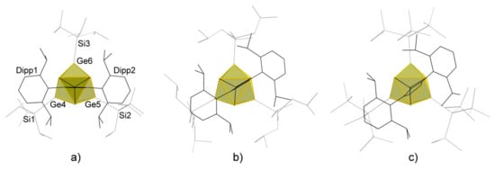 - Schnepf, A. {Ge9[Si(SiMe3)3]3}-: A Soluble Polyhedral Ge9 Cluster Stabilized by only Three Silyl Groups. Angew Chem. Int. Ed. 2003, 42, 2624. [Google Scholar] [CrossRef] [PubMed]