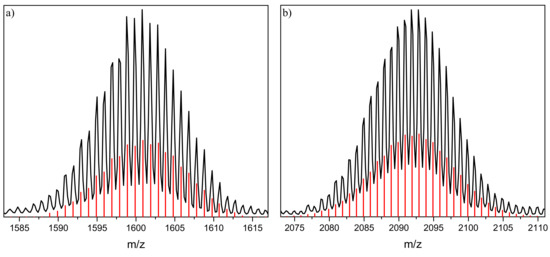 Selected areas of the ESI-MS spectrum obtained by examination of an acetonitrile solution of compound 2. (a) Negative ion mode (4500 V, 300 °C), monitoring 2 with a cleaved [Cu-NHC]+ moiety at m/z 1600.8 [NHCDippCu{Ge9(Si(TMS)3)2}]− and (b) positive ion mode (6000 V, 300 °C), monitoring 2 with an attached potassium cation at m/z 2092.8 [(NHCDippCu)2{Ge9(Si(TMS)3)2}K]+. The simulated mass spectra with the corresponding isotope distribution are shown below as red bars.