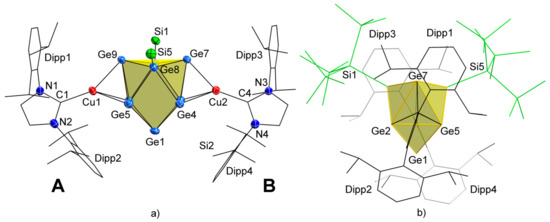 The two [NHCDippCu]+ moieties coordinate in a η3-fashion to the two opposed trigonal faces of the [Ge9] unit adjacent to the uncapped rectangle (Ge6-Ge7-Ge8-Ge9) and include the germanium atoms (Ge7 or Ge9), which do not bind to a silyl group (Figure 5). Hence, the interaction between the bis-silylated [Ge9] cluster and the two [NHCDippCu]+ moieties (A and B; Figure 5a) in 2 mirrors the coordination mode, which has previously been observed in Zintl cluster coinage metal NHC compounds of tris-silylated [Ge9] cluster species. The mean Cu-Ge distances dmean(Cu-Ge) in 2 (2.513(1) Å for A and 2.509(1) Å for B; Figure 5a), as well as the Cu-CCarbene distances (1.941(5) Å for A and 1.913(5) Å for B), are in good agreement with those observed in 1 and in [NHCDippCu{η3-Ge9R3}] (R = Si(iBu)3, Si(TMS)3) [19,24]. However, the coordination of Cu1 and Cu2 by NHC and Zintl cluster deviates more from linearity (162.88(2)° for A and 163.92(2)° for B; Table 2) than that in 1 (Table 1). Furthermore, the two NHCDipp moieties show a staggered orientation towards themselves and the silyl groups (Figure 5b). Both of these observations can be explained by interactions between the TMS groups of the hypersilyl ligands with the Dipp wingtips of the NHC ligands.