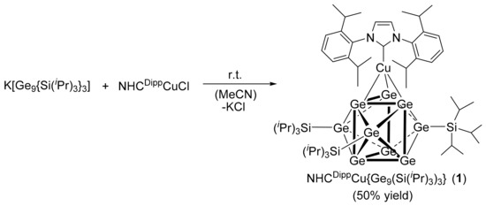 Synthesis of compound 1 from K[Ge9{Si(iPr)3}3] and NHCDippCuCl.