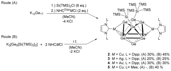 - Geitner, F.S.; Fässler, T.F. Introducing Tetrel Zintl Ions to N-Heterocyclic Carbenes—Synthesis of Coinage Metal NHC Complexes of [Ge9{Si(SiMe3)3}3]−. Eur. J. Inorg. Chem. 2016, 2688. [Google Scholar] [CrossRef]