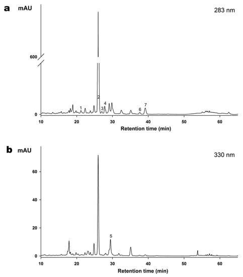 High performance liquid chromatography (HPLC) analysis with detection at 283 nm (a) and 330 nm (b) of the ZQE. Samples were analyzed using 15–75% methanol in 0.3% formic acid for 70 min. 1: Eriocitrin, 2: Naringin, 3: Hespiridin, 4: Neohesperidin, 5: Rhoifolin, 6: Naringenin, 7: Poncirin.