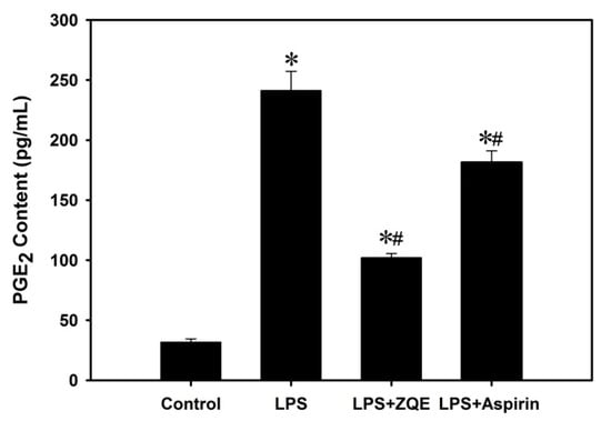 Effects of ZQE on the PGE2 production in LPS-induced RAW 264.7 macrophages. The cells were pretreated with ZQE (250 μg/mL) and aspirin (250 μg/mL) in the presence of LPS (1 μg/mL) for 12 h, and aspirin was used as a positive control. The production of PGE2 in the supernatant were assayed using ELISA kits. The data shown are from three independent experiments and expressed as mean ± SD. * p < 0.05 and # p < 0.05 compared the control (with no LPS, ZQE, or aspirin) and LPS alone, respectively. LPS: lipopolysaccharide; PGE2: Prostaglandins E2; ELISA: enzyme-linked immunosorbent assay.