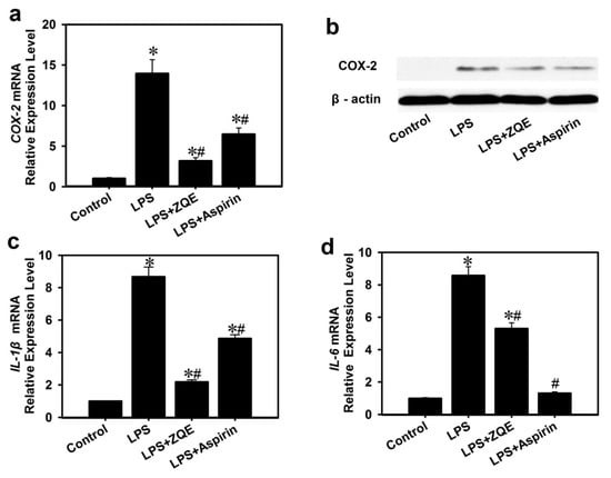Effects of ZQE on LPS-induced COX-2, IL-1β and IL-6 expression in RAW 264.7 macrophages. The concentration of LPS is 1 μg/mL, and aspirin was used as a positive control, and the concentrations of ZQE and aspirin are both 250 μg/mL. (a) COX-2 mRNA expression; (b) COX-2 protein expression, β-actin as a loading control; (c) IL-1β mRNA expression; (d) IL-6 mRNA expression. The data shown are from three independent experiments and expressed as mean ± SD. * p < 0.05 and # p < 0.05 compared the control (with no LPS, ZQE, or aspirin) and LPS alone, respectively. COX-2, cyclooxygenase-2; LPS, lipopolysaccharide; PGE2, Prostaglandins E2; IL-1β, interleukin 1β; IL-6, interleukin 6.