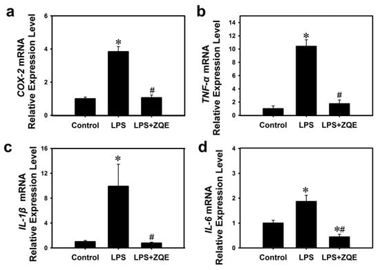 Effects of ZQE on LPS-induced mRNA expression of COX-2, TNF-α, IL-1β, and IL-6 (a–d) in primary BMDCs. The concentrations of LPS and ZQE is 100 ng/mL and 1 μg/mL, respectively. The data shown are from three independent experiments and expressed as mean ± SD. * p < 0.05 and # p < 0.05 compared the control (with no LPS or ZQE) and LPS alone, respectively. LPS: lipopolysaccharide; COX-2: cyclooxygenase-2; TNF-α: tumor necrosis factor-alpha; IL-1β: interleukin 1β; IL-6: interleukin 6; BMDCs: bone marrow-derived dendritic cells.