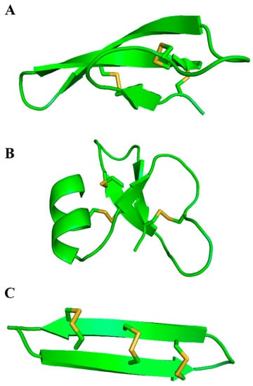 Defensins belong to the β-sheet class of antimicrobial peptides in vertebrates [44]. They are cysteine-rich peptides, with three disulfide bridges composed of six cysteine molecules. They are divided in three subfamilies: α-, β-, and θ-defensins, according to the position of disulfide bridges (Figure 1).
