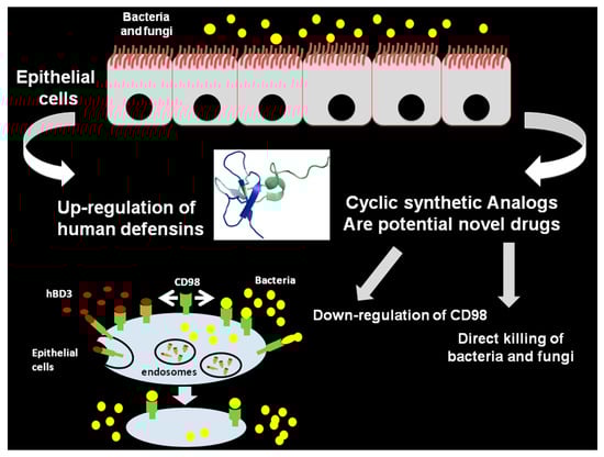 Inhibition of bacterial infections on epithelial cells by human β-defensins and potential cyclic analogs. The schematic representation shows the crosstalk between bacteria and peptides. Antimicrobial activities of peptides include the direct killing and down-regulation of CD98.