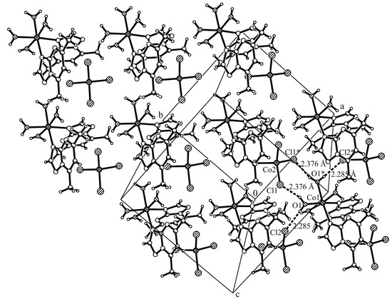 The Co1-N bond lengths of 2.154(2) Å are in the range observed for [Co(dmtp)2(H2O)4]Br2∙2H2O [15] and for [Co(dmtp)2(H2O)4](NO3)2 [29] species containing the same complex cation. The Co1–O bond lengths fluctuate between 2.085(2) and 2.113(2) Å indicating that the water molecules are involved in additional interactions. The tetrahedral Co2 ion is surrounded by four chloride ions with Cl–Co2–Cl angles varying from 108.3(1) to 113.6(1)° and Co2–Cl bonds lengths ranging from 2.276(1) to 2.278(1) Å (Table S1, Supplementary Materials).