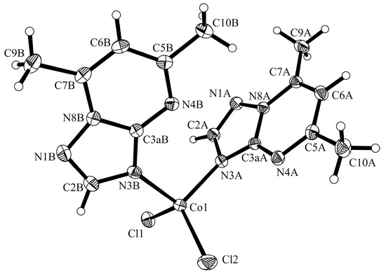 Complex [Co(dmtp)2Cl2] (2) crystallizes in the orthorhombic Pbca space group and the Co1 atom adopts a tetrahedral coordination environment by linking to two chloride anions and two triazolopyrimidine molecules through the N3 atom (Figure 4). The Co1–N3A and Co1–N3B bond lengths are shorter in comparison with those observed for octahedral Co(II) compounds [15,29]. The C2A–N3A and C2B–N3B bond lengths are longer in comparison with the free ligand as result of the nitrogen atom coordination (Table S3, Supplementary Materials).