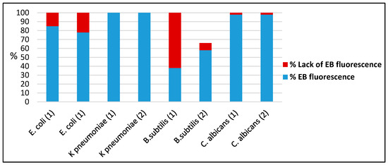 The flow cytometric measurements of EB fluorescence revealed that the exposure of microbial cells to the compounds 1 and 2 did not cause a significant increase of permeability for this dye, indicating that the microbial efflux pumps activity was not affected. An exception was the compound (1) which exhibited a good efflux pump inhibitory activity against the B. subtilis strain (Figure 10) demonstrated by increased level of EB fluorescence as compared to the viable control cells.