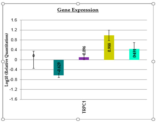 The effects of the tested compounds (100 µg mL−1 solution) on the expression of TRPC1 gene (dmtp, dark green; (1), magenta; (2), olive; (3), light green).