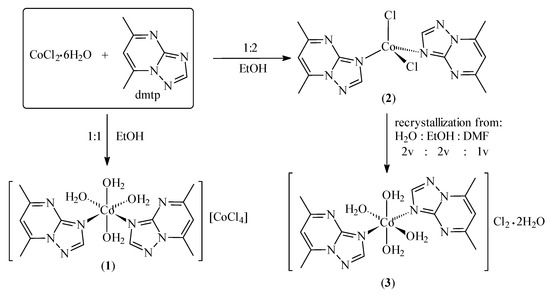 The 5,7-dimethyl-1,2,4-triazolo[1,5-a]pyrimidine (dmtp) ligand produces the complexes [Co(dmtp)2(OH2)4][CoCl4] (1) and [Co(dmtp)2Cl2] (2) in its reactions with cobalt(II) chloride in 1:1 and 1:2 molar ratio, respectively. The compound [Co(dmtp)2(OH2)4]Cl2∙2H2O (3) was obtained from the recrystallization of compound 2 from a mixture of water containing solvents, as depicted in Scheme 1.