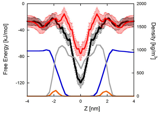 PMF profiles of the insertion of TempL (black) and Q3K-TempL (red) into a bilayer formed by Lipid-A. As reference, the density profiles of different parts of an unperturbed lipid-A bilayer are also reported. In particular, the water density profile is reported in blue and that of lipid tails and phosphate groups are reported in gray and orange, respectively. Roughly, the two peaks of the phosphates represent the boundaries of the membrane environment.