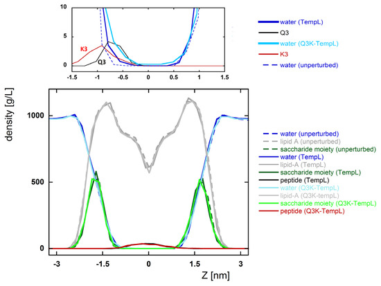 Density profile along the axis perpendicular to the bilayer plane (Z axis) calculated on the structures in the absolute minimum of the PMF profile. The reported profiles refer to water (broken blue, solid blue and solid cyan for unperturbed bilayer, with TempL and with Q3K-TempL, respectively), lipid-A (broken gray, solid gray and solid light gray for unperturbed bilayer, with TempL and with Q3K-TempL, respectively), the saccharide moiety of lipid-A (broken dark green, solid dark green and solid light green for unperturbed bilayer, with TempL and with Q3K-TempL, respectively). The black and red lines refer respectively to the whole TempL and Q3K-TempL peptides (below) and to the Q3 and K3 side chain residues (above). To highlight the effects of the mutated residue, the graph above reports a magnification of the central region of the density profile.