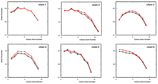 Deuterium order parameter for the six lipid chains of the lipid-A calculated starting from the structures in the global minimum of the PMF profile. Black, red and dashed-gray lines refer to TempL, Q3K-TempL, and unperturbed bilayer, respectively.
