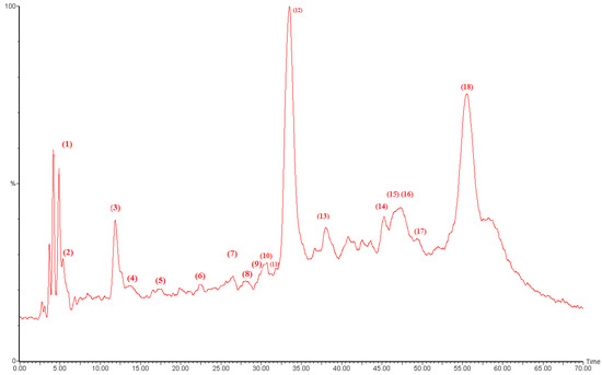 Chromatographic separation was performed on an Alliance e2695 HPLC system (Waters, Bedford, MA, USA) equipped with a RP-xTerra MS column (150 × 4.6 mm i.d., 3.5 μm particle size), photodiode array detector (PDA) and interfaced with a triple quadruple mass spectrometer (MSD 3100, Waters) fitted with an ESI ion source. The sample (20 μL) was eluted through the column with a gradient mobile phase consisting of A (0.1% formic acid) and B (acetonitrile acidified with formic acid 0.1%) with a flow rate of 0.5 mL/min. The following multistep linear solvent gradient was used: 0–40 min: 14–26% B; 40–60 min: 15% B; 60–75: 0% B; 75–80 min: 14% B. The HPLC-PDA-ESI-MS chromatogram spectral data were stored and processed with Masslynx 4.1 data system. Each peak in the chromatogram was accomplished in a single chromatographic run in order to be identified [34].