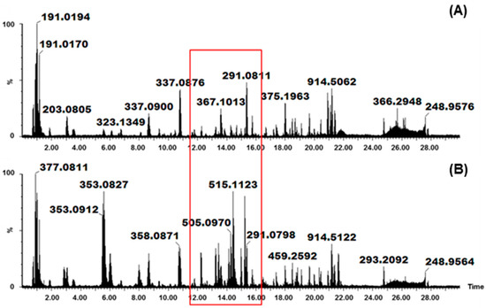 Ultra-high performance liquid chromatography (UHPLC) mass chromatograms, obtained using electrospray ionization (ESI) in negative mode, representing pressurized hot water extraction (PHWE) of Vernonia fastigiata metabolites at: (A) 50 °C; and (B) 200 °C.