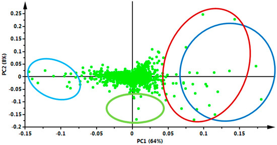 PCA loadings plot showing the selection of V. fastigiata metabolites associated with different extraction temperature conditions. The mass ions on the upper-left quadrant (light-blue ring) are associated with PHW extraction at 50 °C; ions on the lower-right quadrant (green ring) are associated with extraction at 100 °C, and ions on the right (upper and low; red and dark-blue ring) quadrants are associated with extraction at 150 °C and 200 °C.