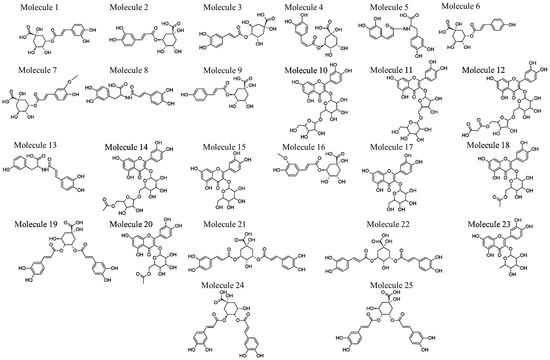 HCA derivatives found in V. fastigiata include 1–9, 13, 16, 19, 21–22 and 24–25 (Table 1 and Figure 4). For annotated chlorogenic acids (1–4, 6–7, 9, 16, 19, 21–22 and 24–25), six types of fragmentation rules were noted: neutral ions attributed to the loss of a quinic acid (−174 Da), caffeic acid (−162 Da), p-coumaric acid (−146 Da) and ferulic acid moieties (−176 Da), as well as carbon dioxide (−44 Da) and H2O (−18 Da).