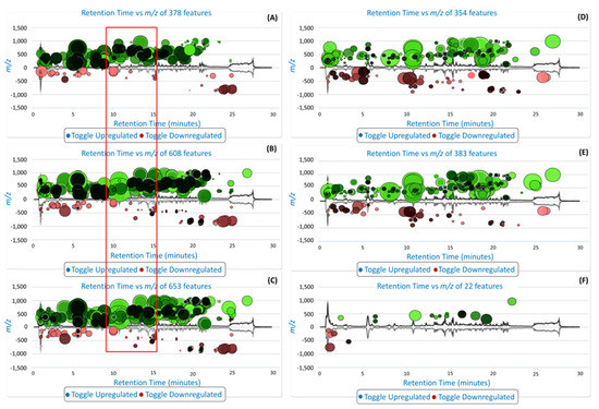 Liquid/gas chromatography mass spectrometry (XCMS) cloud plot of UHPLC-MS data: (A) ion comparisons between 50 °C and 100 °C; (B) ion comparisons between 50 °C and 150 °C; (C) ion comparisons between 50 °C and 200 °C; (D) ion comparisons between 100 °C and 150 °C; (E) ion comparisons between 100 and 200 °C; and (F) ion comparisons between 150 °C and 200 °C. The ions that are enhanced due to an increase in temperature (100 °C, 150 °C and 200 °C) are shown in the top plots (in green) and the ions that were extracted at a low temperature are shown in the bottom plot (in red).