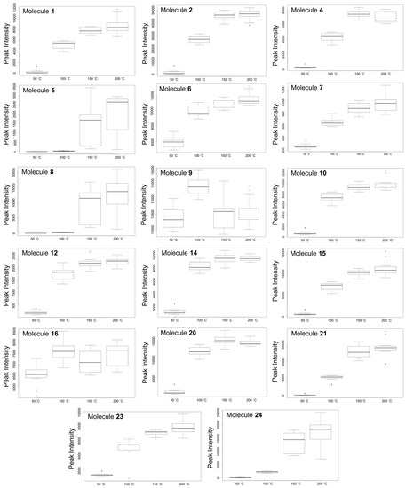 The results show a further increase in temperature, however, leads to a point of saturation where the number of extracted metabolites do not increase beyond a certain extraction temperature (Figure 5F), i.e., between 150 °C and 200 °C in this case. Here, only 22 features were altered between 150 and 200 °C (Figure 5F), compared to the 653 features that were altered between 50 °C and 200 °C (Figure 5C). This cloud plot (Figure 5F) explains the clustering of plant samples extracted at these temperatures (150 °C and 200 °C) previously observed on the PCA score plot (Figure 2), where very little differences between these samples were observed. Furthermore, at such elevated temperatures (150 °C and 200 °C) differences in the classes of extracted metabolites may be too minor to show significant differences or thermally labile metabolites may have undergone degradation [10]. For instance, previously it was reported that elevated temperatures resulted in the formation of carcinogenic compounds such as hydroxymethylfurfural [30]. These possibilities suggest that some metabolites may require optimal temperature conditions for extraction. The best extraction temperature condition(s) for each annotated metabolite (Table 1) were graphically described by box-and-whiskers plots (boxplot) (Figure 6), where, following ANOVA analysis, it was possible to indicate temperature conditions that resulted in significant differences (p value ≤ 0.01) in yield patterns for each metabolite. However, the levels of some pharmacologically relevant metabolites (e.g., 3, 11, 13, 17–19, 22 and 25) were not statistically significant (p value ≤ 0.01) across data sets and were thus not graphically presented by boxplots. From the boxplots (Figure 6), the general trend observed is that an increase in temperature results in an increase in the intensity of each molecule/metabolite. However, sensitivity to temperature of some molecules was also observed, where at temperatures below 100 °C, molecules 5 and 8 were not extracted at all. However, the intensities of these molecules show an increase with an increase in temperature, for instance at 150 °C and 200 °C. Some molecules, however, were negatively affected by temperatures beyond 100 °C and show a decrease in the intensity, possibly due to thermal decomposition (for instance, molecule/metabolite 9) (Figure 6).