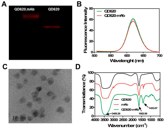 The conjugation of QD620 and monoclonal antibody anti-RUS. (A) the gel electrophoretic mobility of QD620 before and after conjugation; (B) the fluorescence spectra of QD620 before and after conjugation (The excitation wavelength was set at 400 nm); (C) the TEM images of QD620-mAbs; (D) the FT-IR spectra of QD620, mAbs, and QD620-mAbs.