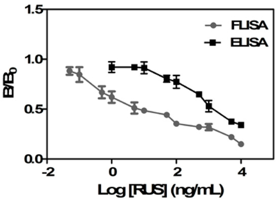 The inhibition curves for the determination of RUS by indirect competitive ELISA and FLISA.