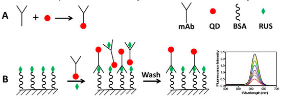 The FLISA method was as shown in Figure 7. The procedure was performed according to relevant references with some modifications [34]. Briefly, opaque white microtiter plates were coated with 100 μL RUS-BSA (10 μg/mL) in carbonate-bicarbonate buffer (pH 9.6; 0.05 M) and incubated at 4 °C for overnight. After three washes, the plate was blocked with 0.5% gelatin in PBST with 150 μL/well and incubated for 1 h at 37 °C. Then, 50 μL of standard serial dilutions of RUS were added into the plate followed by the 50 μL of diluted mAb-QD conjugates (1:100) and incubated for 2 h at 37 °C. After three washes, the plate was added 100 μL of PBS (pH 7.4; 0.01 M) into each well and recorded the fluorescence intensity with excitation wavelength of 400 nm and emission wavelength of 620 nm.