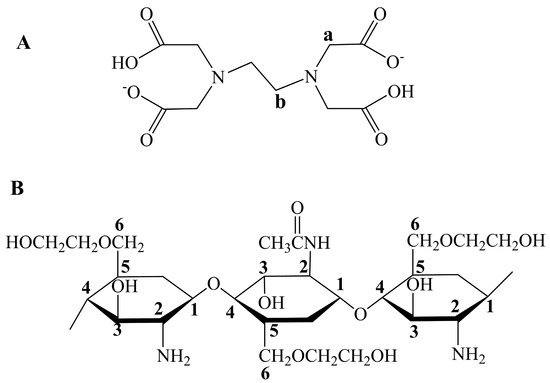 Structures of EDTA (A) and glycol chitosan (GCS) (B). The protons along the backbones of EDTA and GCS are numbered for subsequent peak assignments in NMR spectra.