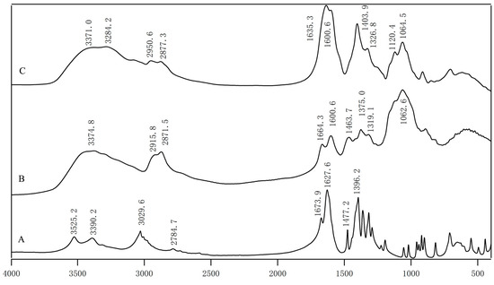 The FTIR spectra of Na2-EDTA (A); GCS (B); GCS-EDTA (C) synthesized with a GCS:EDTA mass ratio of 1:30 and followed by complete removal of free EDTA.