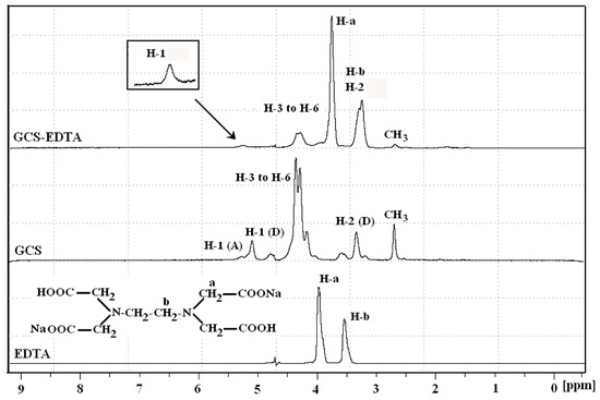 1H-NMR spectra of Na2-EDTA, GCS and GCS-EDTA synthesized with a GCS:EDTA mass ratio of 1:30 in pOD 10 solutions at 70 °C. The numbered protons along the backbones of EDTA and GCS are shown in Figure 1. The (D) refers to deacetylated residues, while the (A) refers to acetylated residues.