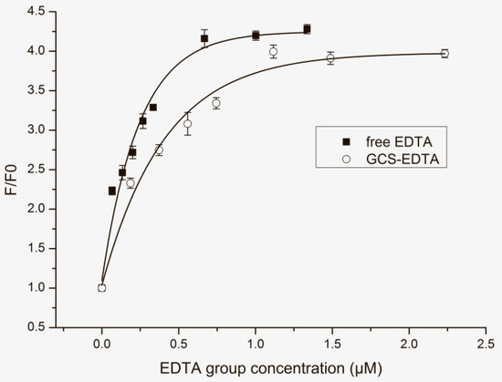 The effect of cobalt ion chelation resulted from EDTA and GCS-EDTA with different EDTA group concentrations on the normalized maximum fluorescence emission intensity of calcein (0.0625 µg/mL). The molar ratio of calcein to cobalt dichloride was 1:1. Data were fitted with the Asymptotic Regression Model in software OriginLab of version 8.5 (OriginLab, Northampton, MA, USA), and adjusted R2 EDTA and GCS-EDTA were 0.97 and 0.98, respectively.