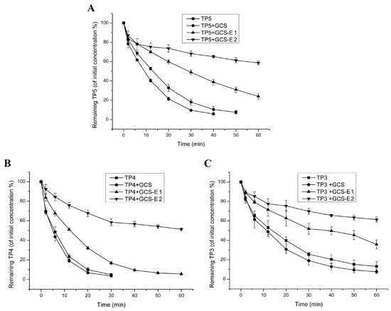 Degradation kinetics of TP5 (A), TP4 (B) and TP3 (C) in the absence and presence of GCS and GCS-EDTA. In all groups, each peptide (0.1 mM) was incubated with LAP (0.01 U/mL) at 37 °C. GCS, 0.50% (w/v); the concentrations of GCS-EDTA synthesized with a GCS:EDTA mass ratio of 1:30 in group GCS-E 1 and 2 were 0.0001 mg/mL and 0.01 mg/mL, respectively.