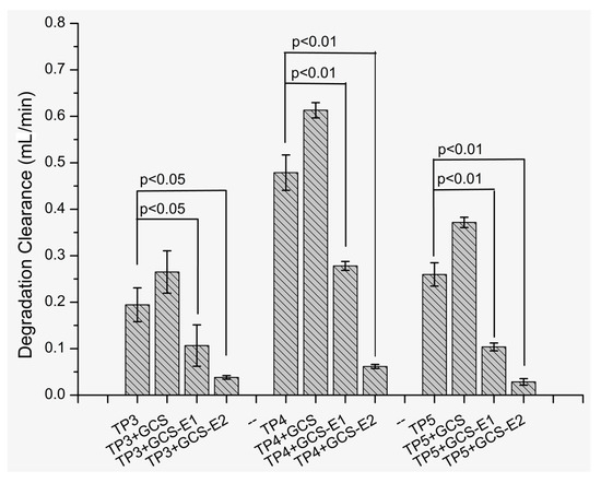 Degradation clearance of TP3, TP4 and TP5 in the absence and presence of GCS and GCS-EDTA. In all groups, each thymopoietin oligopeptide (0.1 mM) was incubated with LAP (0.01 U/mL) at 37 °C. GCS, 0.50% (w/v); the concentrations of GCS-EDTA synthesized with a GCS:EDTA mass ratio of 1:30 in group GCS-E 1 and 2 were 0.0001 mg/mL and 0.01 mg/mL, respectively.