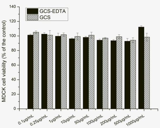 MDCK cells were transferred to 96-well plates (Corning Inc, New York, NY, USA) at a density of 5 × 103 cells/well and cultured for 24 h in a humidified incubator, at 37 °C with 5% CO2. The culture medium was then replaced with Dulbecco minimum essential medium containing GCS and GCS-EDTA of different concentrations, respectively. After 24 h coincubation at 37 °C, the medium was replaced with 20 μL of MTT (5 mg/mL in phosphate buffered saline) and 100 μL of incubation medium and incubated for a further 4 h at 37 °C. After incubation, the medium was removed, and 100 μL of dimethyl sulfoxide (DMSO) was added to the residual precipitates. The absorbance of formazan was determined at 490 nm, using an iMark™ microplate reader (Bio-Rad Laboratories, Hercules, CA, USA). Cell viability was expressed as a percentage of the absorbance relative to that of the control. Control cells were not exposed to any materials. The experiments were performed with three replicate wells for each sample and control.