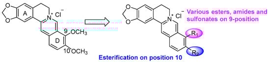 Natural isoquinoline alkaloid berberine (BBR, Figure 1), as a nonprescription anti-diarrhea drug, has been extensively used in China for decades with a confirmed safety. Recently, several other pharmacological and biological properties of BBR including anti-inflammatory and anti-carcinogenic activities have been identified [10,11,12,13,14,15,16]. It was reported that BBR could suppress NF-κB activation induced by various inflammatory agents or carcinogens with a mild potency [17]. In our study, BBR’s moderate anti-inflammatory potency was further confirmed by an inhibitory rate of 36% at the concentration of 5 μM. The unique isoquinoline skeleton of BBR provoked us to conduct structural modification and optimization to enhance the anti-inflammatory effect. Therefore, in our present study, taking BBR as the lead, a series of novel BBR analogues defined on the substituents of ring D (Figure 1) was achieved to elucidate the structure-activity relationship (SAR) and develop a novel class of anti-inflammatory agents. Specifically, novel ester, amide, and sulfonate BBR derivatives were prepared and evaluated for their effect to inhibit TNF-α-induced NF-κB activation, and the mechanism exploration of the key compounds was carried out as well.