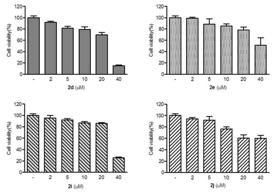 Cytotoxic effects of compounds 2d, 2e, 2i and 2j on 293T cells. Following pretreatment with compounds 2d, 2e, 2i and 2j at the indicated concentrations for 24 h, the cell viability of 293T cells were determined by MTT assay.