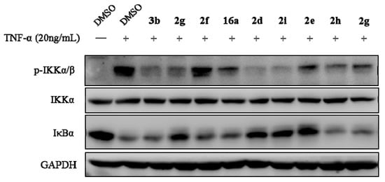 BBR analogues inhibited TNF-α-induced NF-κB activation by impairing IκB kinase (IKK) phosphorylation. Following pretreatment with BBR analogs 2d–j, 3b and 16a (10 μM) for 2 h, 293T cells were treated with TNF-α (20 ng/mL) for 30 min. The phosphorylation of IKKα/β (Ser180/181) and expression levels of IKKα and IκBα were measured by Western blot using corresponding antibodies. GADPH = glyceraldehyde-3-phosphate dehydrogenase.