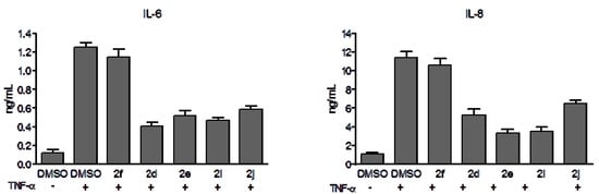 Effects of BBR analogues on TNF-α-induced cytokine of interleukin (IL)-6 and IL-8. Following pretreatment with compounds 2d, 2e, 2f, 2i and 2j (10 μM) for 2 h, 293T cells were treated with TNF-α (20 ng/mL) for 6 h, and then the medium was collected for ELISA analysis.