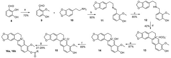 Secondly, compounds 16a and 16b were synthesized through a seven-step process (Scheme 2), using commercially available 2,3-dihydroxybenzaldehyde (8) as the starting materials with the methods reported previously [20,21]. Condensation was conducted between 2-methoxy-3-hydroxy benzaldehyde (9) and homopiperonylamine (10) after selective methylation of 8. In the intermolecular cyclization of the intermediate 12, the skeleton formed according to Pictet-Spengler cyclization and Friedel-Crafts alkylation rule in one step, and, subsequently, the key intermediate 13 was obtained with an ideal yield of 53%. After acidification, alkalization, and esterification, the final products 16a and 16b were purified via flash column chromatography using methanol/dichloromethane as the gradient eluent.