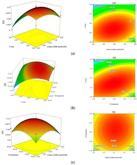 Figure 1c shows the effects of temperature and the DMF-HClSO3 ratio. At a fixed DMF–HClSO3 ratio, increased temperature increased DS rapidly. The interaction between the ratio of DMF–HClSO3 and the temperature did not impact the DS significantly, indicating a reduced effect on the DS when the ration of DMF–HClSO3 was changed from 4:1 to 8:1. The DS was enhanced with increasing temperature and reached a peak value at 50 °C.