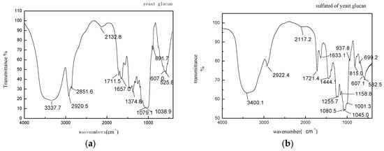 FT-IR made it possible to analyze polysaccharide structures such as monosaccharide types, glucosidic bonds, and functional groups [25]. In all spectra (Figure 2), the band in the region of 3338 and 3400 cm−1 of the YG and the SYG corresponded to the hydroxyl stretching vibration of the polysaccharide and at 2921 and 2922 cm−1 corresponded to a weak C-H stretching vibration. Both indicated that the YG and the SYG were polysaccharides. By comparison with the YG, two characteristic absorption bands appeared in the FT-IR spectra of the sulfated derivatives (Figure 2b). One band in the region of 1256 cm−1 is believed to represent an asymmetrical S=O stretching vibration and the other at 815 cm−1 represents a symmetrical C–O–S vibration associated with the C–O–SO3 group. The data suggested that the SYG was successfully sulfated [25].