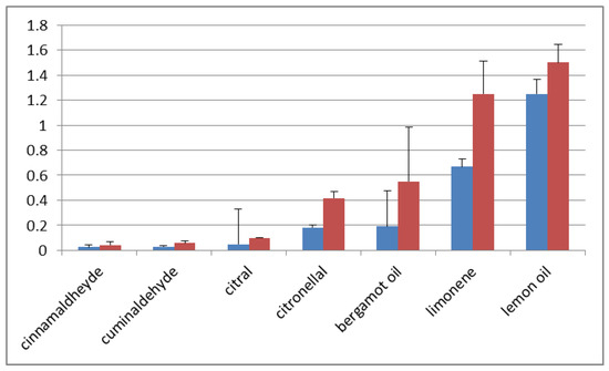 In our study, we have considered seven natural products (bergamot and lemon essential oils, citronellal, citral, cinnamaldehyde, cuminaldehyde and limonene) that are recurrent in medicinal and aromatic plants and were selected taking into account their commercial availability, the fact that they are considered as GRAS (Generally Recognized As Safe) and their low costs.