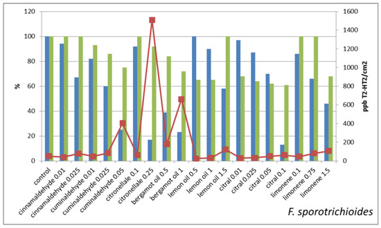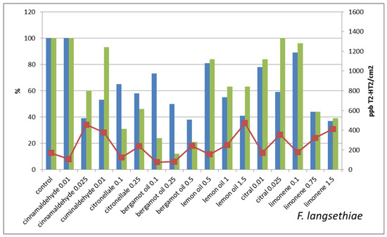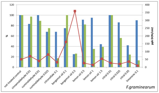 The treatments that strongly reduce mycelium growth all belong to this last class, e.g., F. graminearum treated with 0.5% bergamot oil and F. sporotrichioides treated with 0.25% citronellal and with 1% bergamot oil. On the contrary, treatments that slightly reduce the mycelium growth result in lowering the mycotoxin production in comparison with untreated control, e.g., F. graminearum treated with cuminaldehyde 0.01% or with citral 0.01% or limonene 0.1% and F. sporotrichioides treated with lemon oil 0.5%.