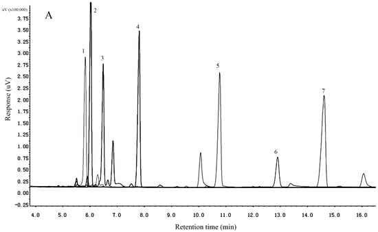 Gas chromatogram profiles of monosaccharide standards, ACP1-1 and ACP2-1. (A) Monosaccharide standards; (B) Monosaccharide composition of ACP1-1; (C) Gas chromatogram of monose compositions of ACP2-1. 1: arabinose; 2: rhamnose; 3: ribose; 4: xylose; 5: mannose; 6: galactose; 7: glucose.