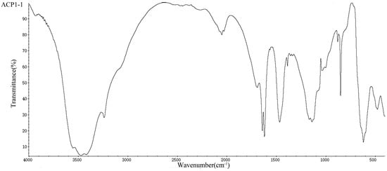 The peak intensities at 280 nm and 260 nm in the UV/Vis spectra of ACP1-1 and APC2-1 were low, which indicated that they contained few protein and nucleic acid impurities. The various biological activities of polysaccharides are strongly related to their chemical compositions and configurations [39]. FT-IR spectroscopy is a powerful technique for the identification of characteristic organic groups in polysaccharides [40] and was used to analyze the structure of ACP1-1 and ACP2-1 in this study. The spectra (Figure 3) of the polysaccharides all displayed a broad peak between 3200 and 3600 cm−1, which was attributed to the stretching vibration of C-OH [41]. An intense peak between 1600 and 1700 cm−1 was attributed to the stretching vibration of C=O and the asymmetric stretching vibration of C=O [42]. An intense and broad band at around 1250–1550 cm−1 was attributed to C-H stretching vibrations, whereas a weak absorption band at about 550–700 cm−1 was attributed to O-H stretching vibrations [43,44]. Peaks between 1000 and 1200 cm−1 indicated the presence of C-O-C glycosidic bonds [45], and a weak absorption at around 849 cm−1 was attributed to a α-glycoside bond [46]. The characterization of ACP1-1 and ACP2-1 by FT-IR showed absorption bands typical of polysaccharides.