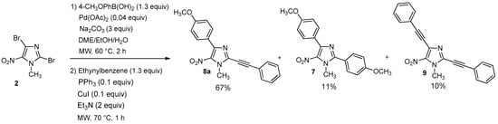 Thus, based on the already optimized regioselective Suzuki-Miyaura reaction conditions and the classical conditions for Sonogashira reaction, we prepared the disubstituted 5-nitroimidazole derivative 8a from 4-methoxyphenylboronic acid and ethynylbenzene (Scheme 3). The first step was performed in presence of 4-methoxyphenylboronic acid (1.3 equiv.), Na2CO3 (3 equiv.), Pd(OAc)2 (0.04 equiv.) in a mixture of DME/EtOH/H2O (3/1/1) under microwave irradiation for 2 h at 60 °C. After cooling, ethynylbenzene (1.3 equiv.), PPh3 (0.1 equiv.), CuI (0.1 equiv.) and Et3N (2 equiv.) were added and the mixture was heated again under microwave irradiation for 1 h at 70 °C. This sequence led to the desired compound 8a in good yield (67%) and compounds 7 and 9 in 11% and 10% yields, respectively (Scheme 3).
