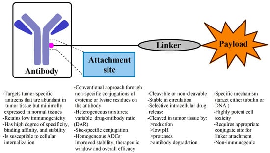 ADC is a complex molecule composed of a mAb conjugated with a highly potent cytotoxic drug (or payload) through an appropriate linker (Figure 1) [10,11]. An ADC is designed as targeted therapy, which targets and kills only cancer cells while sparing healthy cells. The development of ADCs faced a number of challenges in the early 1970s. The first set of ADCs, prepared by conjugating murine KS1/4 antibody with the cytotoxic drug methotrexate or the BR96 antibody conjugated with doxorubicin, were less active than their parent drugs [12,13,14]. The failure of early ADCs resulted from several factors: (a) the chimeric or murine antibodies used in ADCs could elicit immunogenic responses and cause fast clearance in circulation; (b) the cytotoxic drug was insufficiently potent, and further conjugation might lead to decreased potency; (c) inappropriate linkage and the poor selection of antigen could lead to the failure of an ADC.